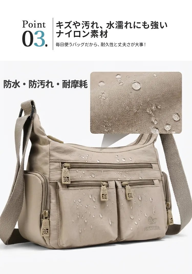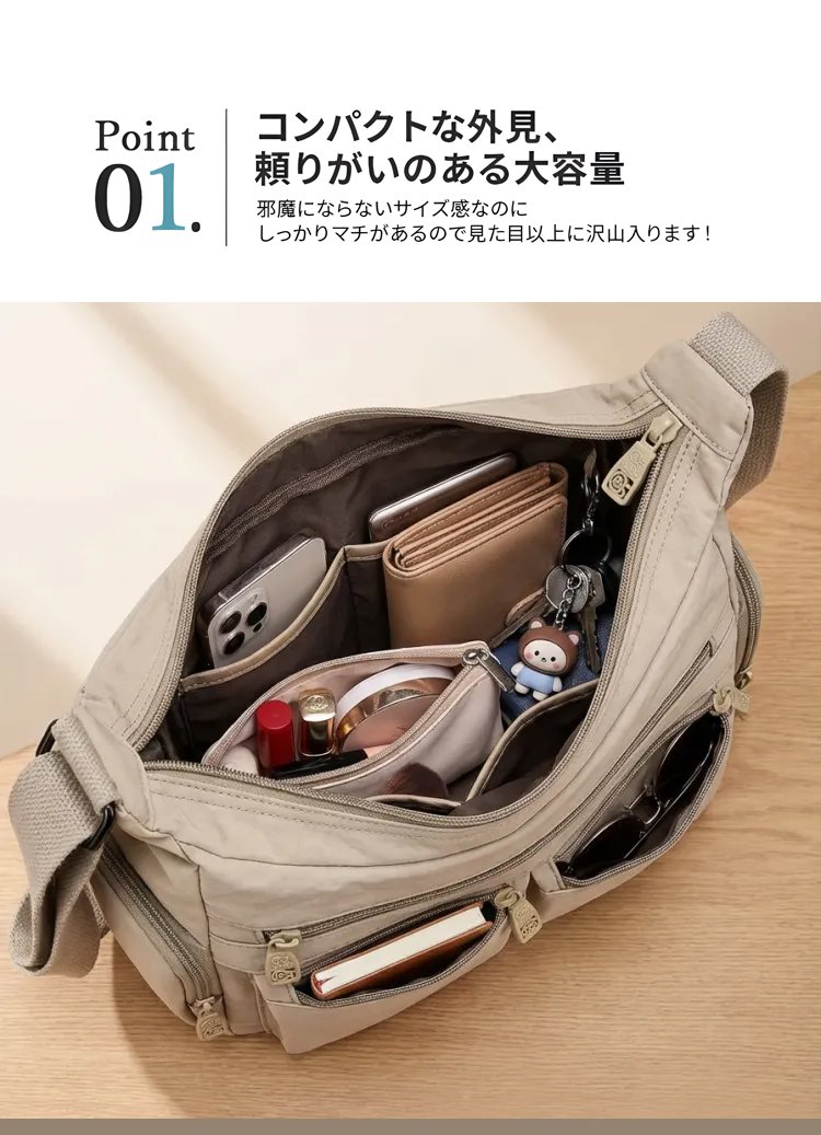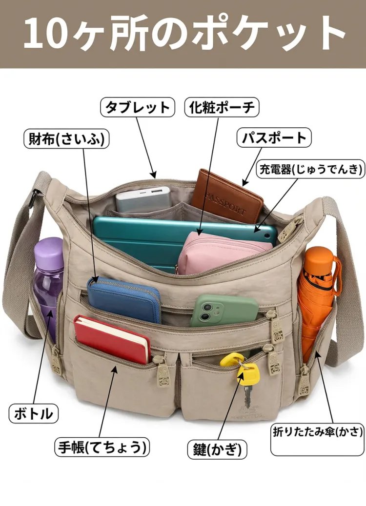 13ポケットの超科学的設計で、タブレット、水筒、折りたたみ傘、化粧ポーチもスッキリ。たっぷり入るのに、見た目は驚くほどスリムでコンパクトなまま。